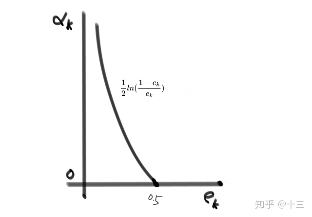 4. 通过 \( e_k\) 计算 \( G_k\) 的权重 \(\alpha_k\) ,这里是应用下面图示关系曲线来计算的,结合函数曲线其实也很容易理解,就是说该第 \( k\) 个弱模型的错误率越低 ,那么这个 弱模型的权重就越高 ,这里 \( 0.5\) 是个很有意思的点,如果在2分类问题中一个模型的正确率为 \( \frac{1}{2}\) ,那么这个模型实则是没有任何作用的,蒙一下也能达到这个正确率,所以对于这种模型来说就是可以丢掉的,权重也就是 \( 0\)