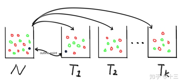 - 为什么能够避免过拟合 。因为过拟合大多数是因为噪声数据造成的,模型把噪声的异常数据当成数据的规律来正常学习了进去,所以导致过拟合,而采用这种随机采样的方式来做的话,图中所示的 \( outline \space point\) 就只会被少数的决策树采样到,这样在最后“投票”的时候,大多数决策树学到的还是正确的规律