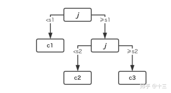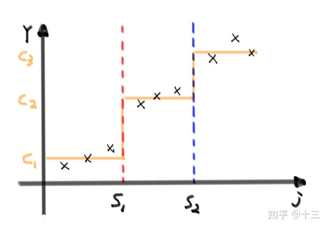 - 在 \( j\) 轴上的 \( s_1\) 点处将数据切成左右两部分(红色虚线左右)