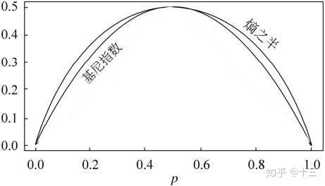 信息熵、基尼指数二者的图像曲线关系如下,熵之半即是 \( Entropy/2\) ,二者的图像很相似,即 \( p=0.5\) 时,熵和基尼指数都 到达最大 , 即最不稳定