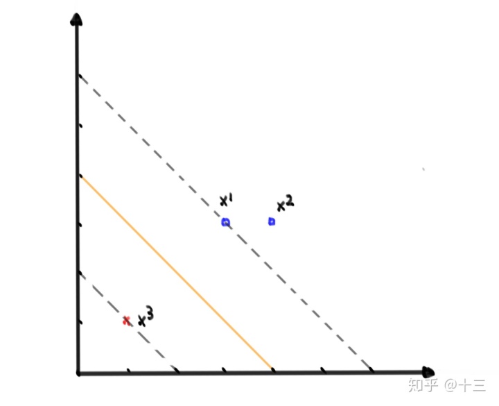 ,其中 \( x^{(1)},x^{(2)}\) 为正例, \( x^{(3)}\) 为负例,求这样最大间隔分离超平面,作图如下