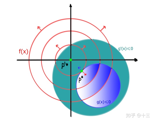 第一种 :图中蓝色 \( g(x)\leq 0\) 部分,目标函数的 最优解在约束条件范围外,此时就相当于约束条件为 \( g(x)=0\) ,因为 \( g(x)<0\) 的部分相较于 \( g(x)=0\) 肯定不是最优的(不够靠近目标函数的最优解嘛),这里通过图中可以直观的看出, 切线交点 \( p^*\) 为最优点 ,是符合约束条件时的最小值,此时二者导数的方向相反,这里与2个注意点需要解释